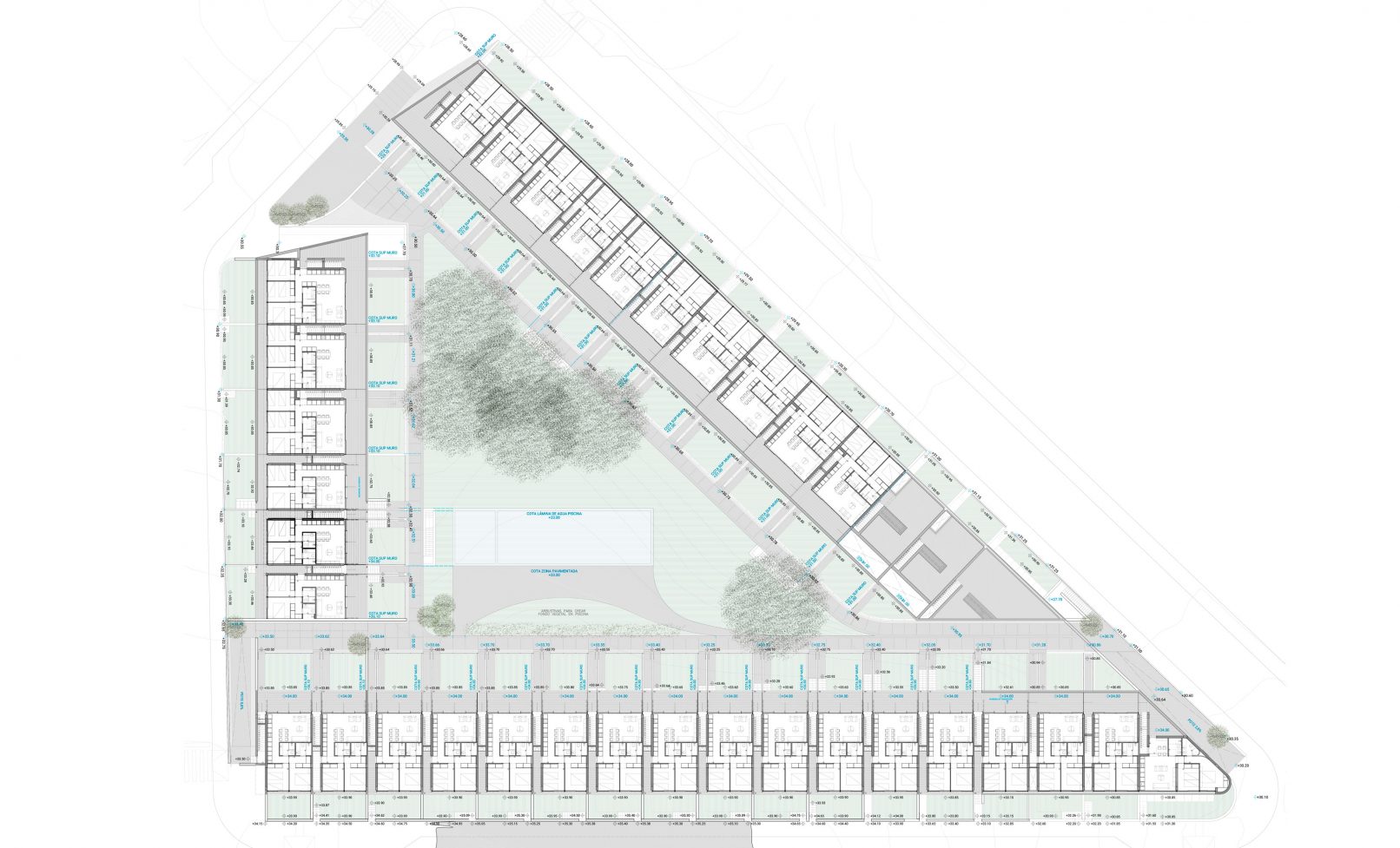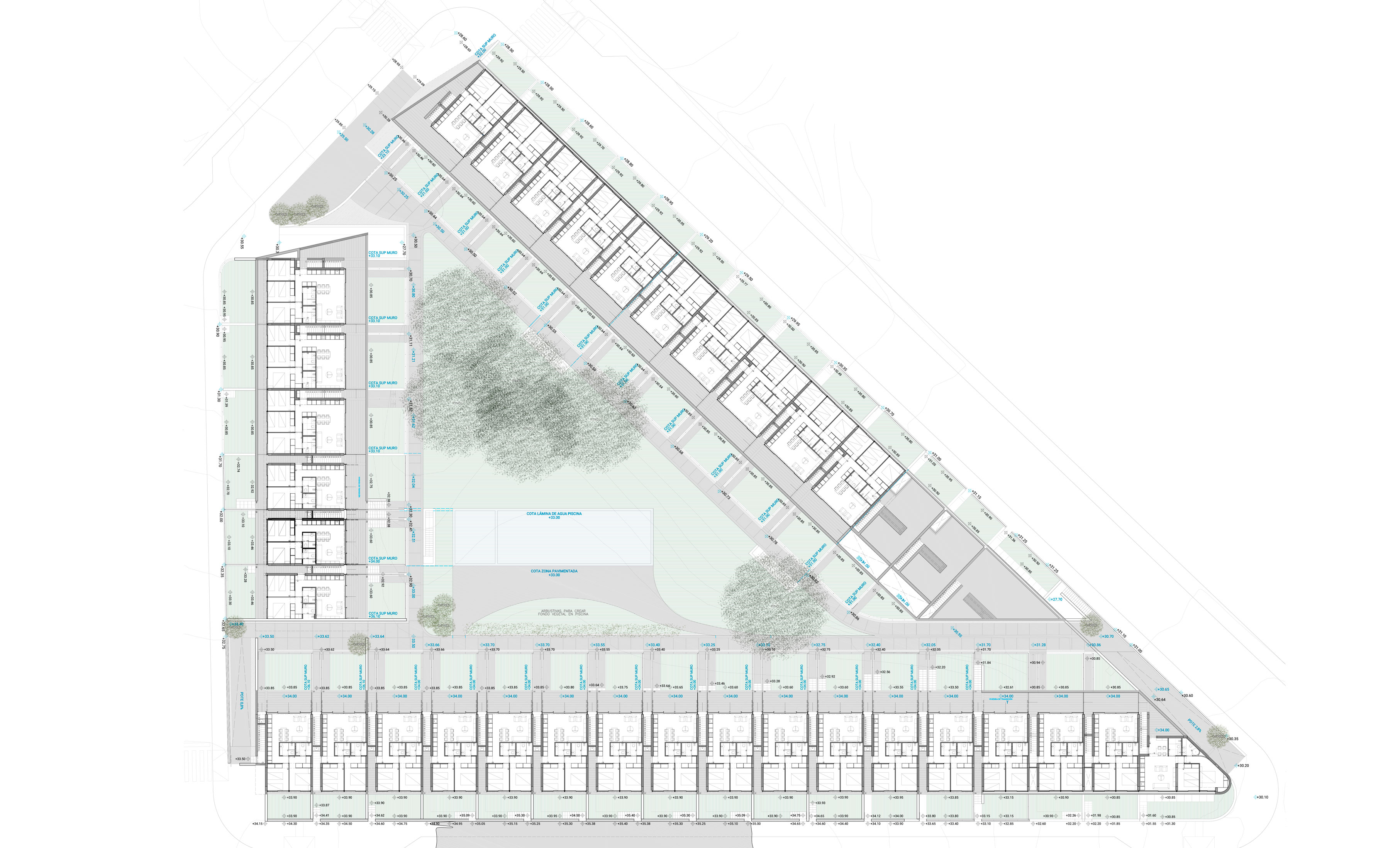 Mirasal es un complejo que contempla la creación de 67 viviendas con grandes zonas de espacios ajardinados y otras dotaciones comunitarias como gimnasio y piscina. Este residencial se concibió de forma completamente distinta a lo usual. Las premisas al abordar el proyecto eran un máximo respeto por la topografía y naturaleza originales de la zona, y un tratamiento de la arquitectura desde el punto de vista tradicional, con materiales y técnicas originales del lugar, tratando de lograr una inclusión perfecta en el entorno. El complejo se divide en tres bloques que se encuentran entre sí en zonas clave de la parcela, que se convierten a la vez en puntos de acceso; los tres bloques siguen una disposición perimetral a la parcela, que parece abrazar el gran espacio verde central, que se concibe como el punto clave del proyecto. Los brazos se componen de agrupaciones de diferentes tipologías de vivienda, que se iban repitiendo aunque experimentando modificaciones y adaptaciones en posiciones especiales como, por ejemplo, las esquinas. La investigación en torno a los diferentes tipos de vivienda y las posibles agregaciones de éstas se produjo de un modo simultáneo, de forma que el resultado tuviera sentido globalmente y el proyecto fuera un proceso de ida y vuelta en constante validación. Las viviendas resuelven eficazmente en el mínimo espacio posible las necesidades de diferentes tipos de familias o usuarios. En cualquier caso, además de las grandes zonas verdes comunes, cada vivienda dispondrá de dos pequeños jardines privativos -en caso de ser vivienda en planta primera se traduciría en terrazas y solarium- que funcionan como una extensión de los espacios interiores de la vivienda.